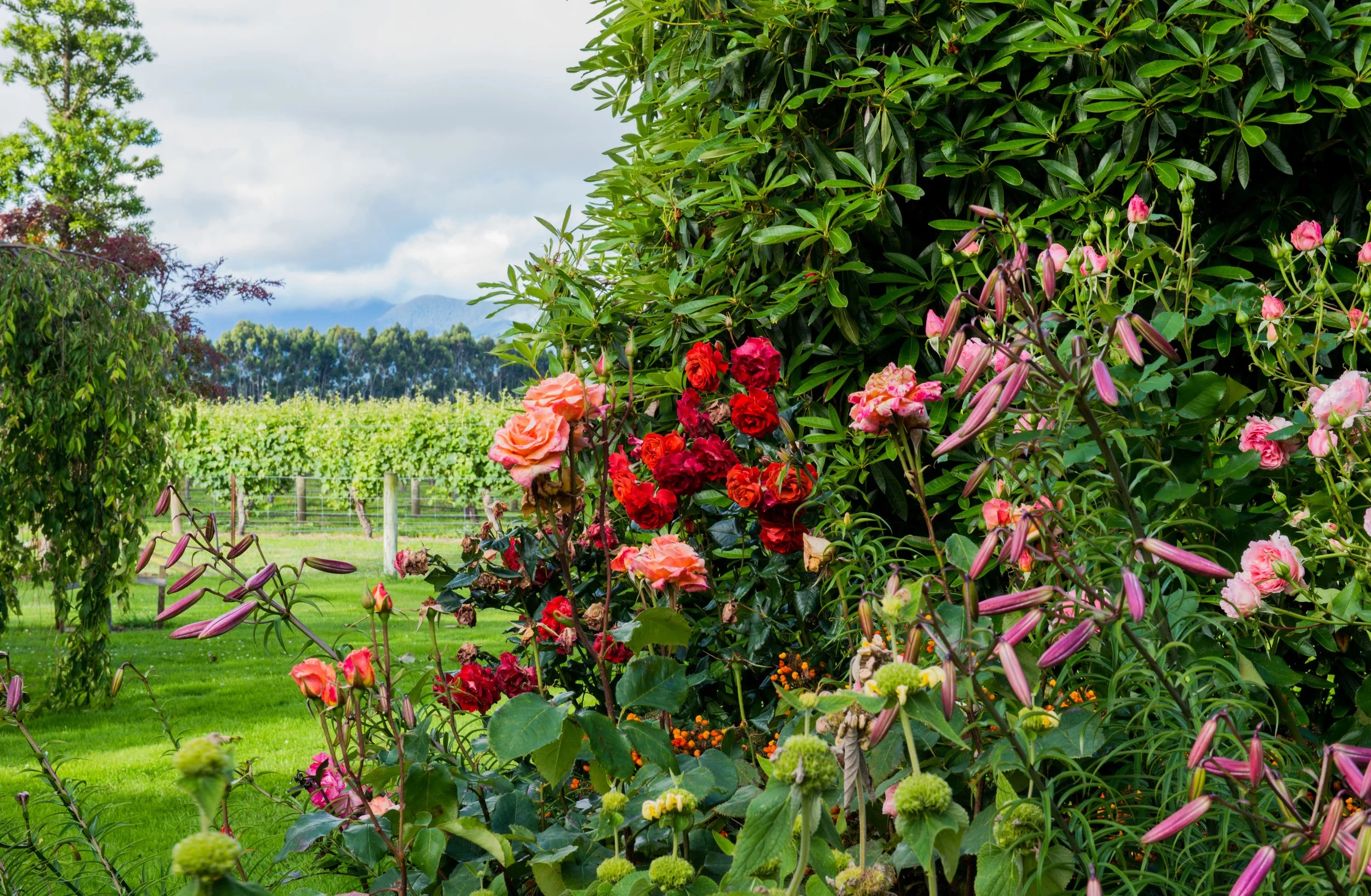 Fringed by rhododendrons the long, graceful lawn invites your eye beyond the stately elm to enjoy the dramatic light changes of the Richmond Ranges.