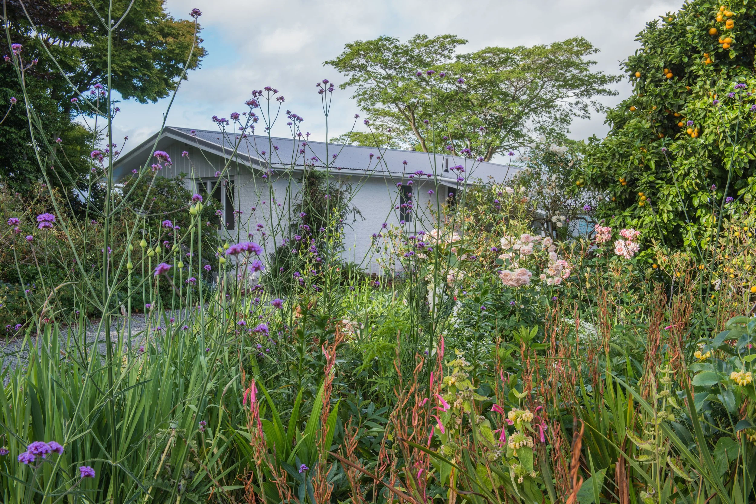 The simplicity of the 1967 white cottage rests easily amongst a collection of period hybrid tea roses and suitably cottagey perennials. Further afield you can experience an unusual mass planting of San Pedro cacti and the beginnings of a New Zealand heritage citrus library. Many of the trees and shrubs date from Duncan and Davies best bred specimens of the 1960s and 1970s.