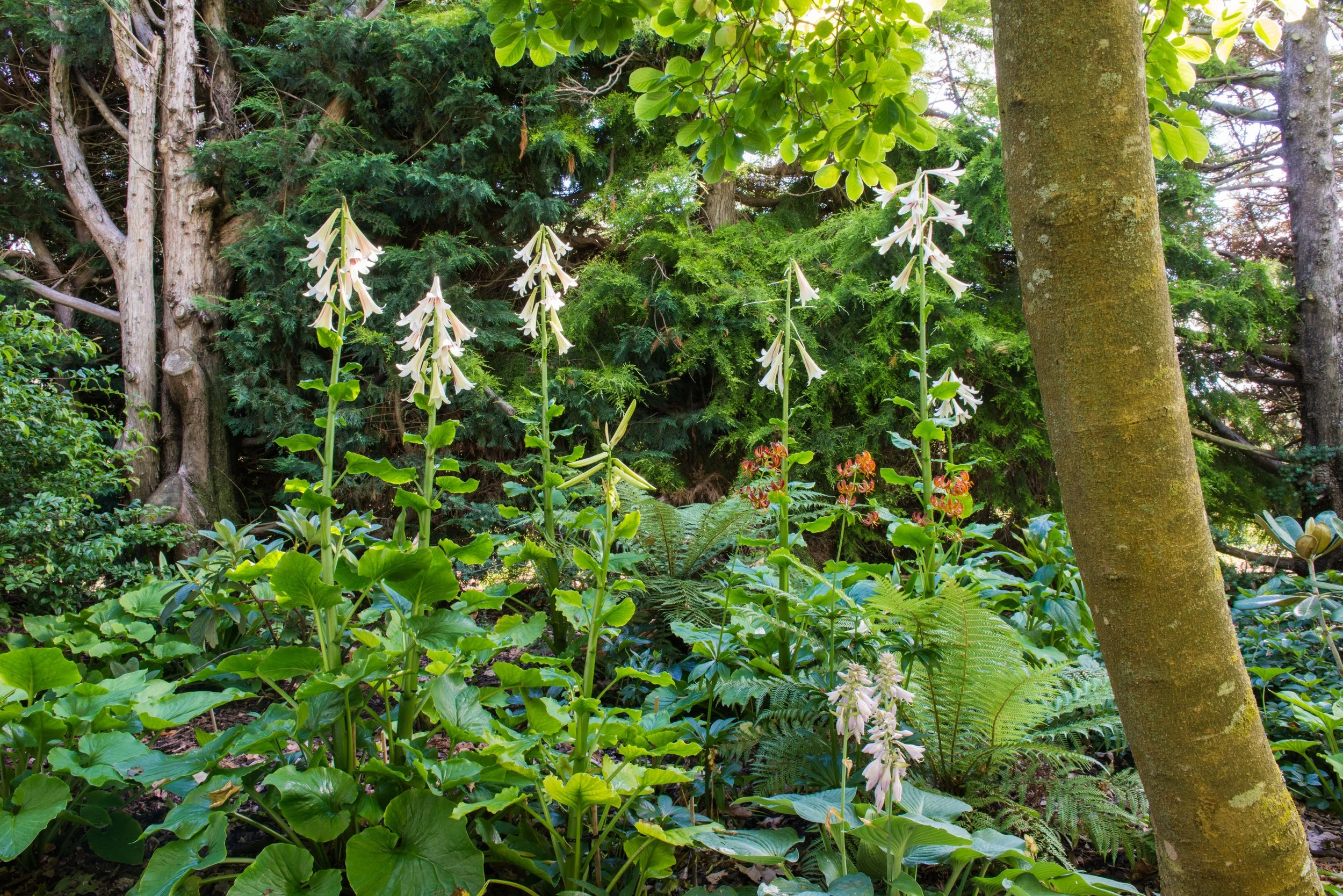 Meander beneath majestic, mature trees through a large, serene woodland crammed with mature rhododendrons, magnolias and underplantings of lilies, ferns and wheki ponga. A magical jungle of naturalising Himalayan Giant Lily will surprise you in December as you wander under a three-metre-high canopy of enormous, perfumed lily trumpets.