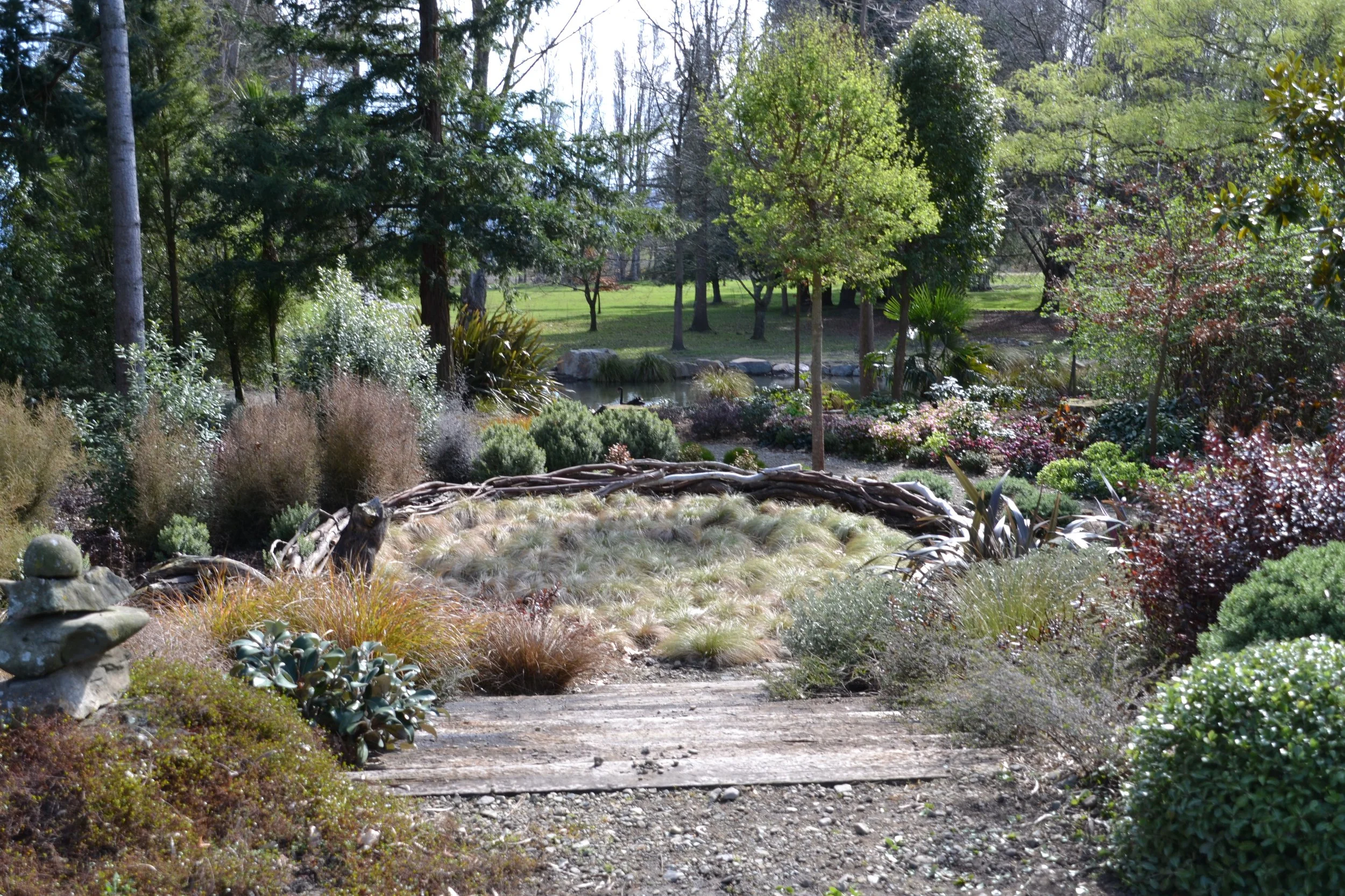 Immense use of water creating a series of five ponds, gives a sense of enormous peace, and ensures wonderful bird life. Heavy old bridge timbers have been used and stone walls have been built over the years which add to the country style. This is a garden that has most things, naturalistic, formal, informal, extensive areas of New Zealand native plants, woodlands, roses, rhododendrons and water. A new dry garden which will have no water other than comes from the sky over the summer is under construction.